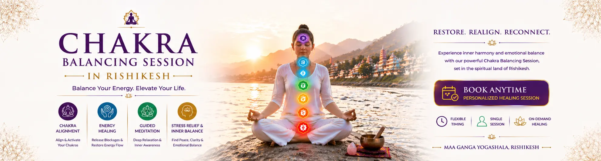 Single Session · Book Anytime · Awaken, align, and heal your seven energy centers in the spiritual land of Rishikesh.